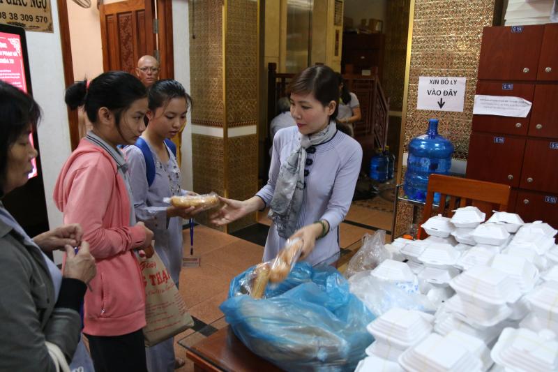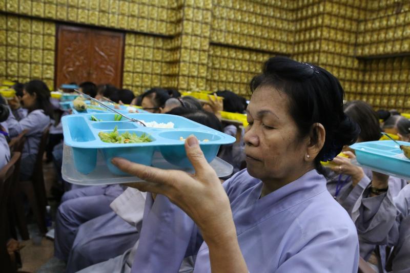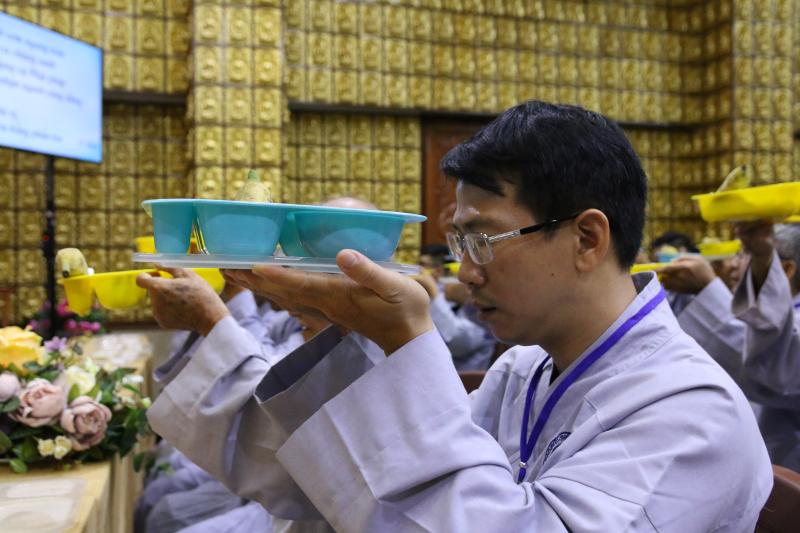 Các Hành giả và Tăng đoàn đã có thời khóa tụng Kinh Người áo trắng. Đâylà bản kinh được TT. Thích Nhật Từ biên soạn Việt hóa. Cũng là bản kinh được thường xuyên trì tụng trong các thời khóa tại chùa, nhằm nhắc nhở các Phật tử thường xuyên thực tập để trở thành người Phật tử đích thực. Tiếp theo là 30 phút thiền buông thư do ĐĐ.Thích Ngộ Phương hướng dẫn trước khi kết thúc chương trình tu tập buổi sáng.