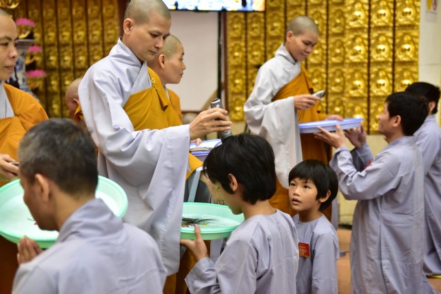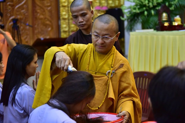 Sau đó là các giới tử cùng tuyên 3 lời phát nguyện mà người xuất gia chân chính cần làm. Sau lời phát nguyện là lễ quán đảnh là phần các giới tử tuyên đọc các giới pháp. 10 giới pháp dành cho Sa-di và Sa-di-ni và 9 giới cho giới tử tiếp nhận Bát Quan Trai giới.