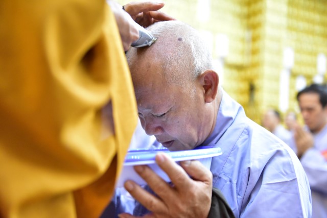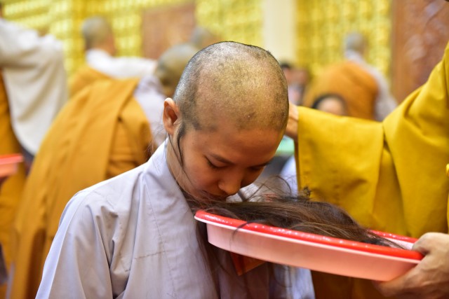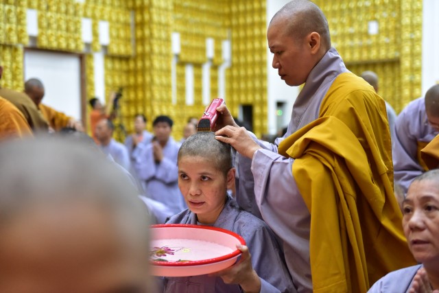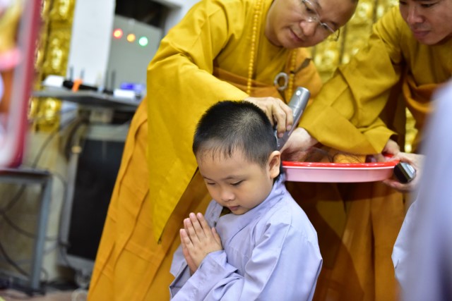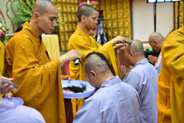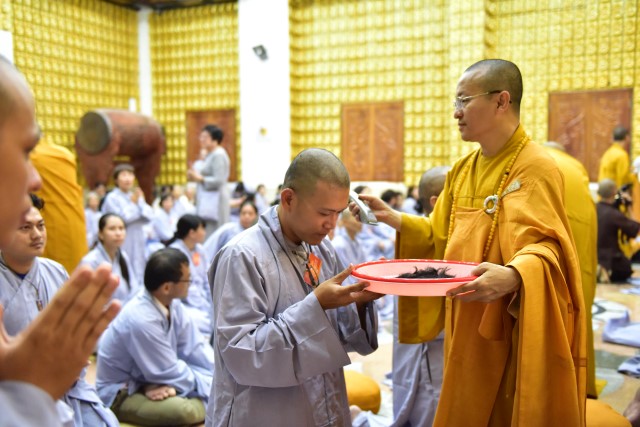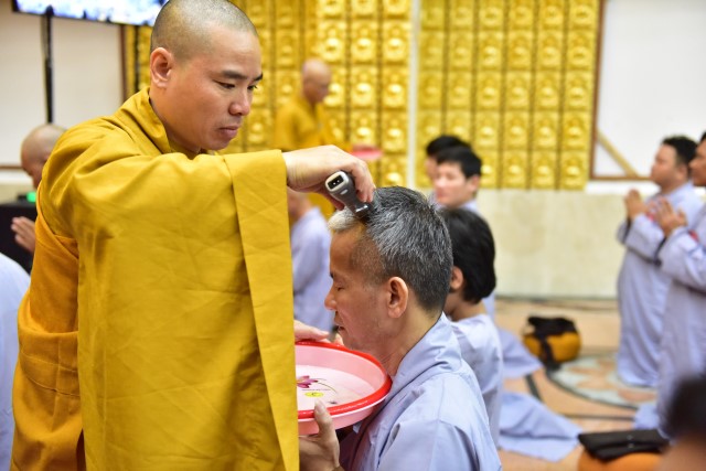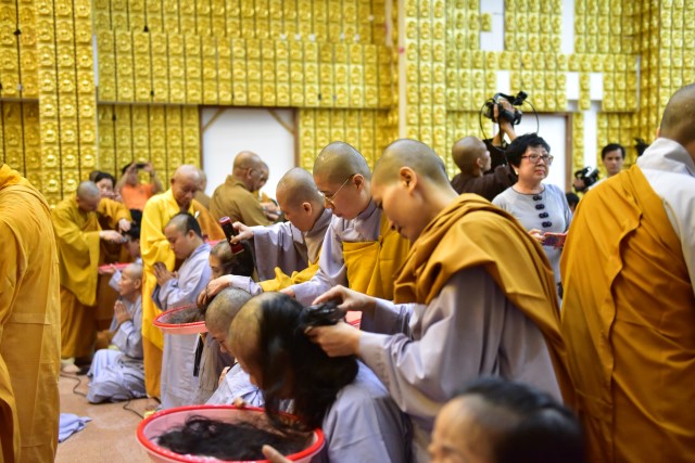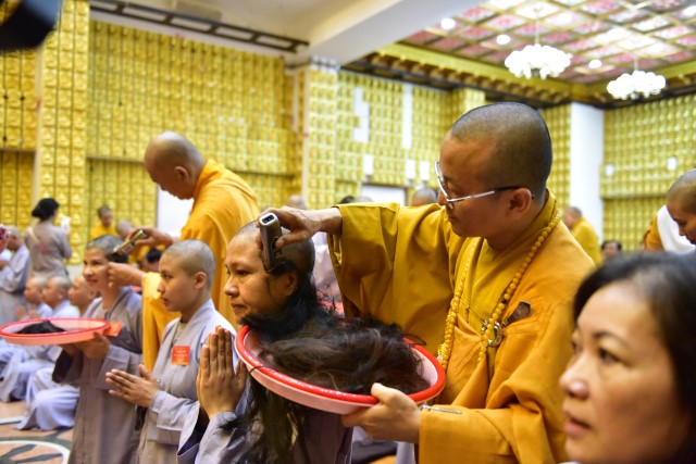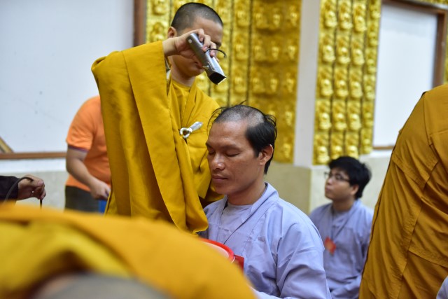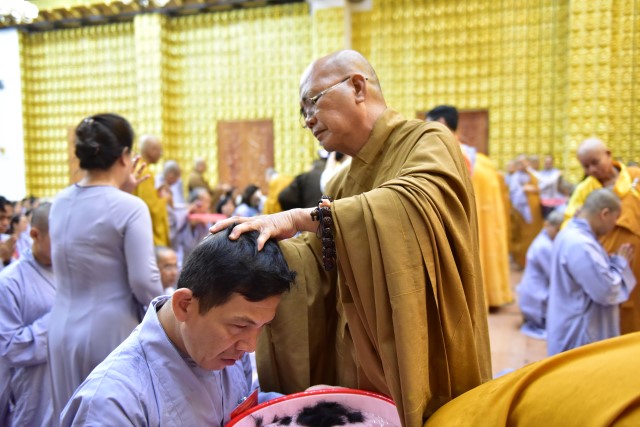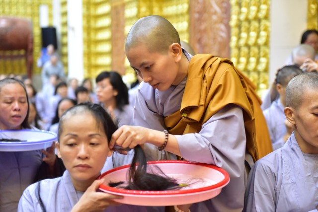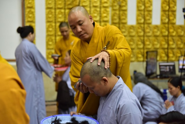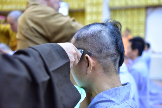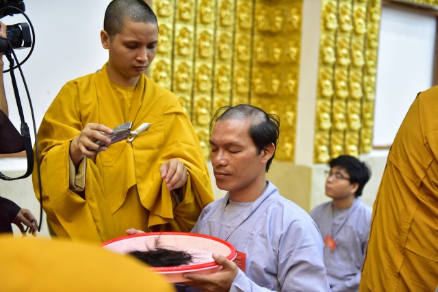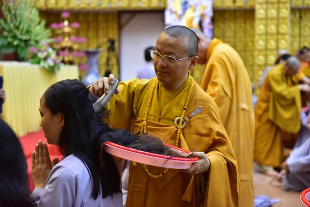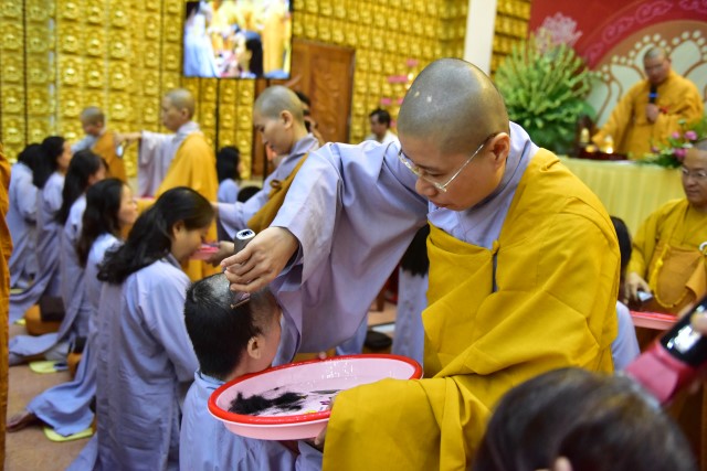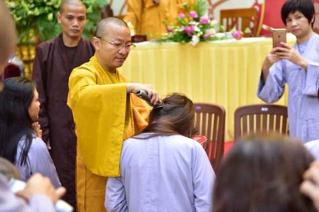 Trước khi các giới tử cạo tóc, đắp y cho giới tử tiếp nhận xuất gia, TT. Thích Nhật Từ giải thích ý nghĩa việc cạo tóc và ý nghĩa của chiếc y mà chỉ vài phút vừa qua những giới tử đã cạo bỏ mái tóc mà theo dân gian Việt Nam là “cái răng, cái tóc là vóc con người”.
