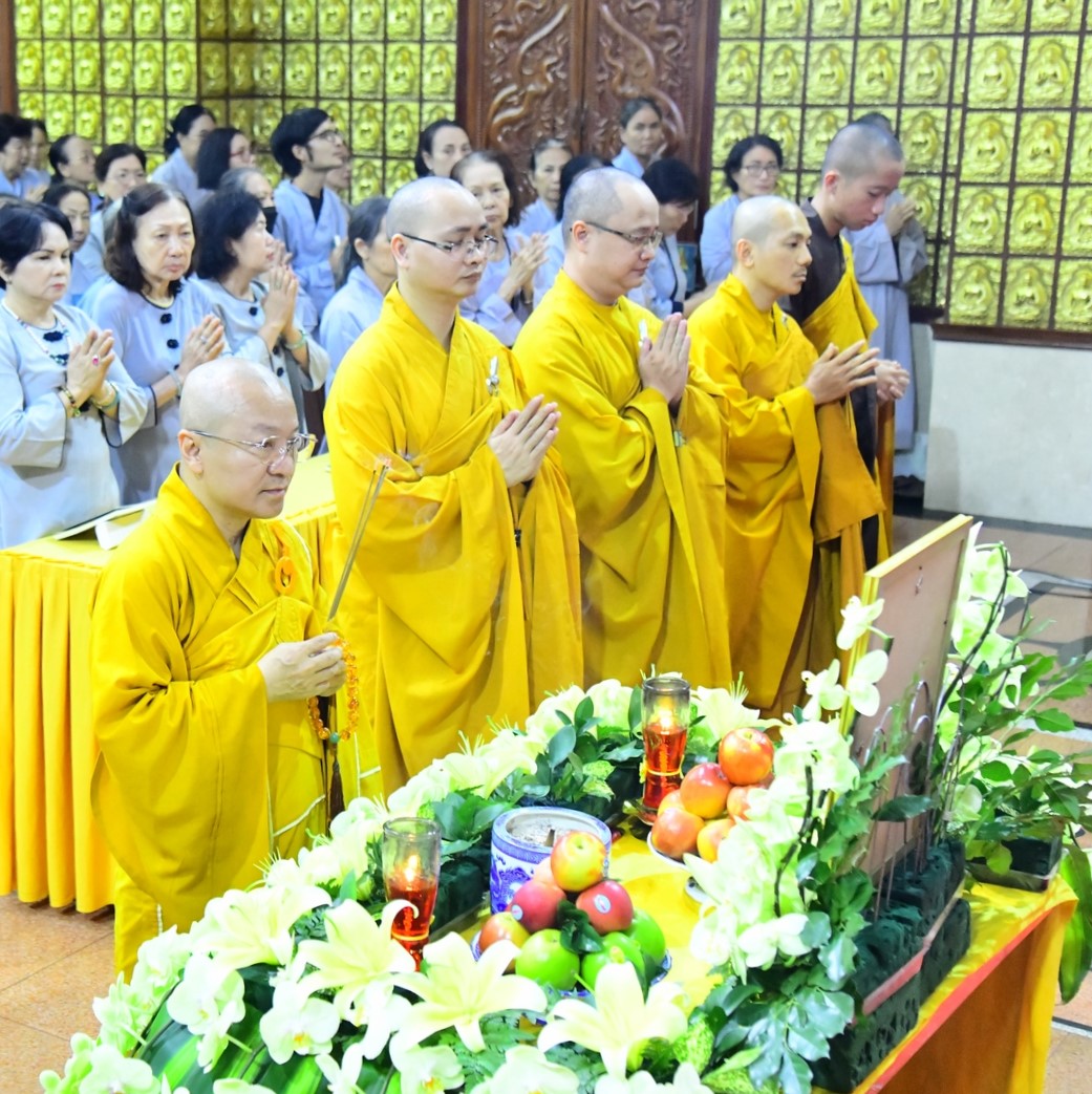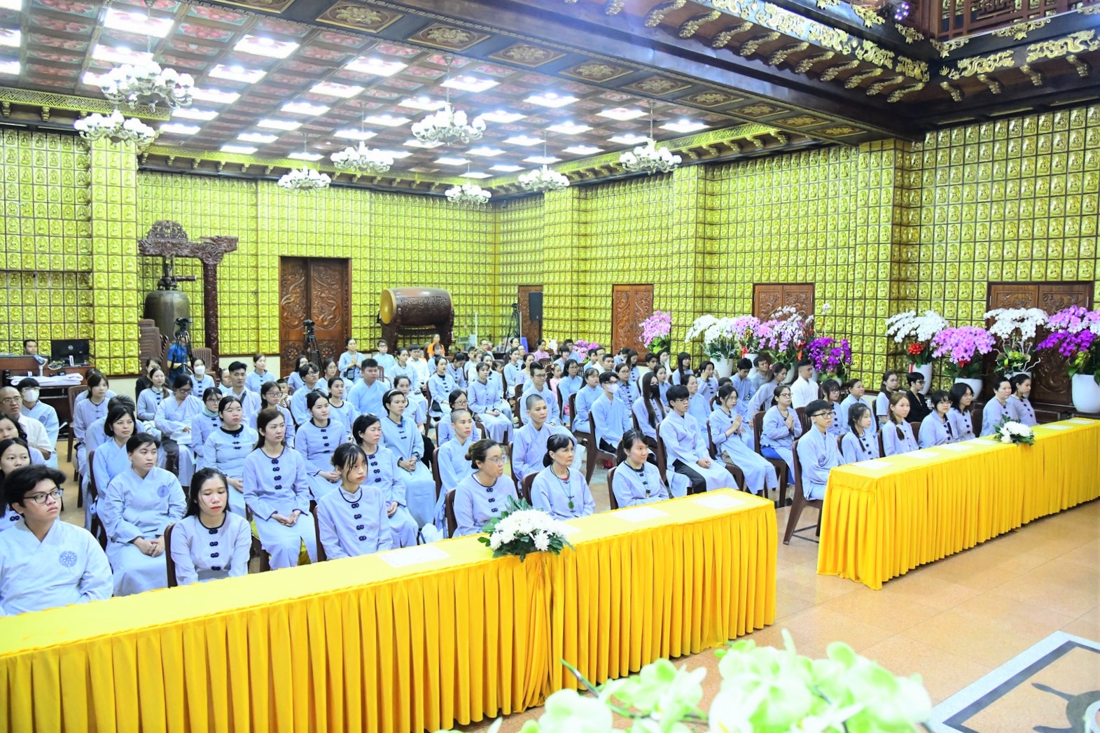 Dưới Ngự toà Tam Bảo, Tăng đoàn đã thân lâm Đại điện chứng minh khoá lễ Quy y cho 145 Phật tử. Hiện diện trên bàn chứng minh có Thầy Trụ trì đạo hiệu Thích Nhật Từ và chư tôn đức thành viên Tăng đoàn.