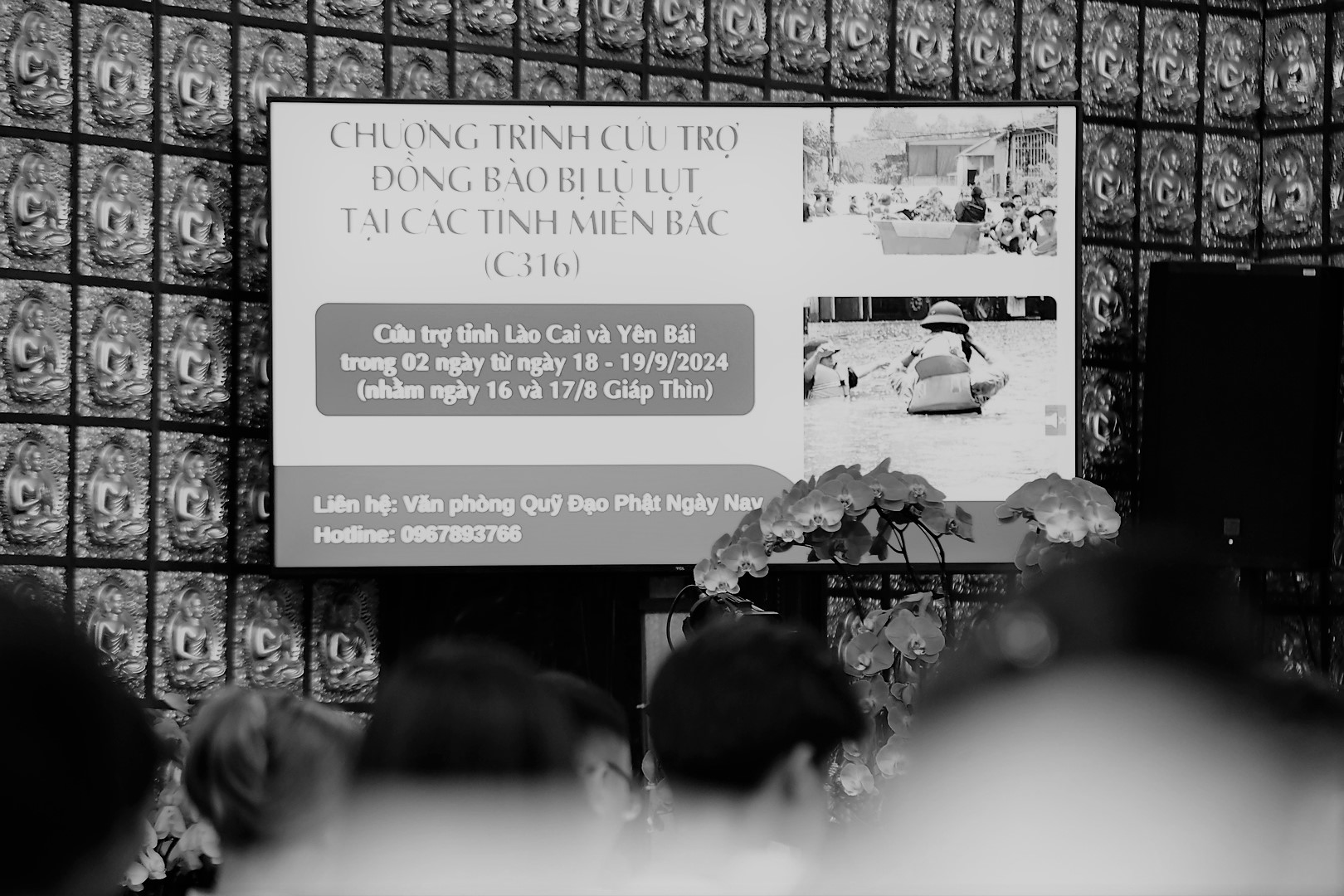 Dưới sự hướng dẫn của Thầy Trụ trì, hội chúng đồng cung cử nghi thức tưởng niệm đồng bào miền Bắc bị thương vong trong cơn bão số 3 vừa qua.