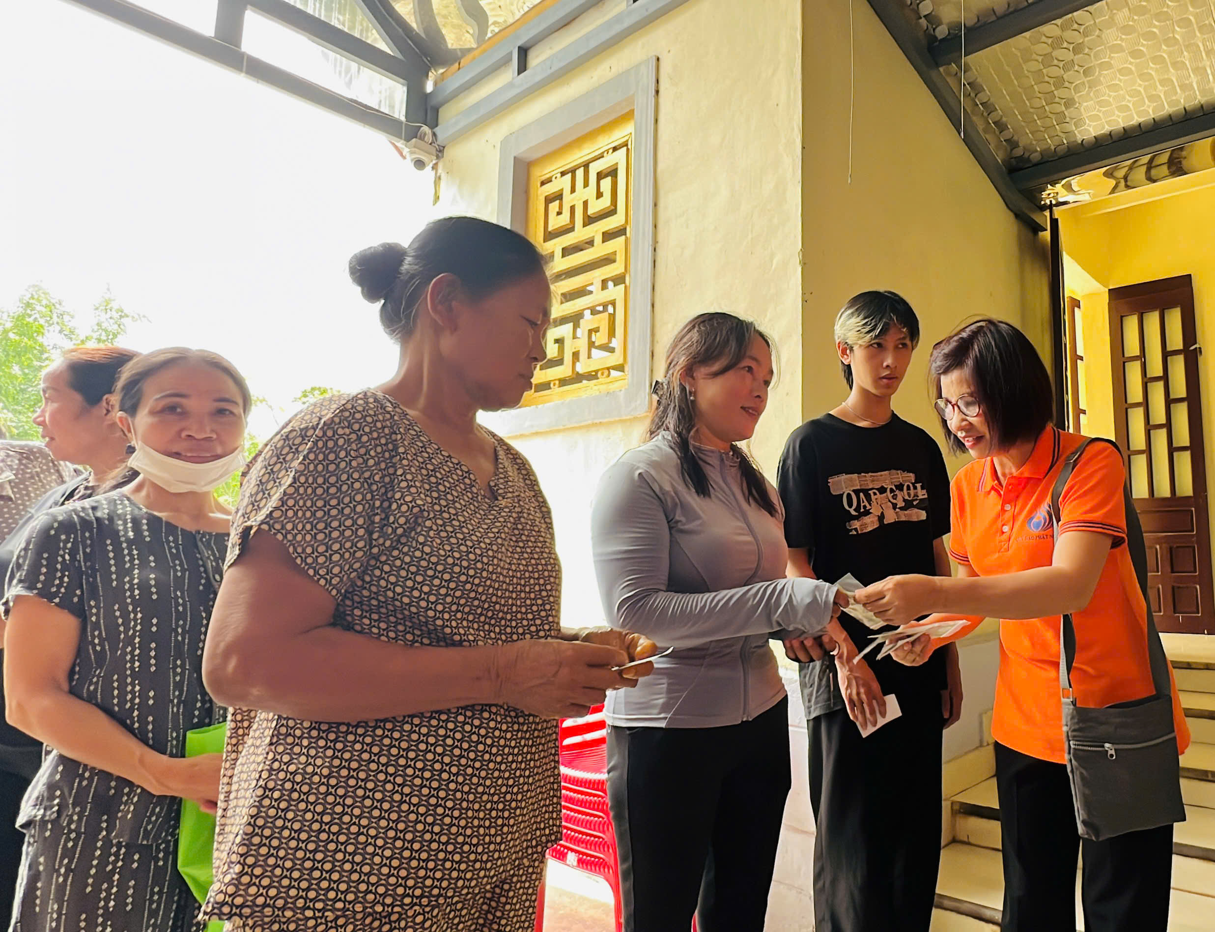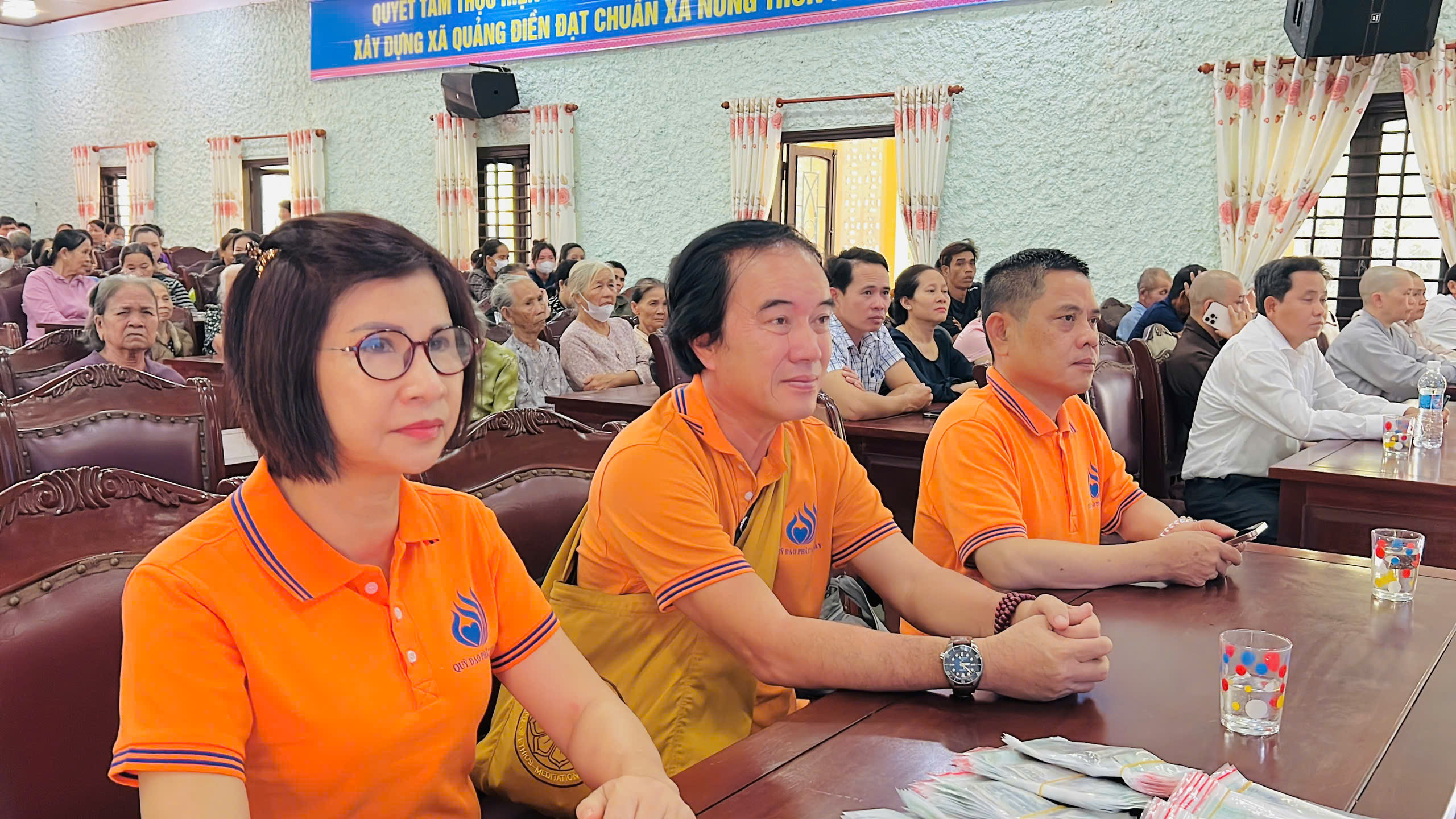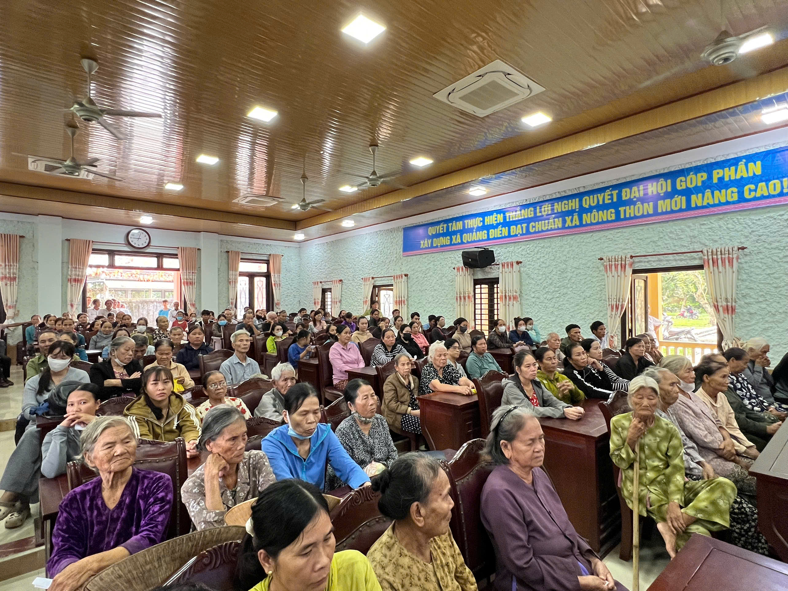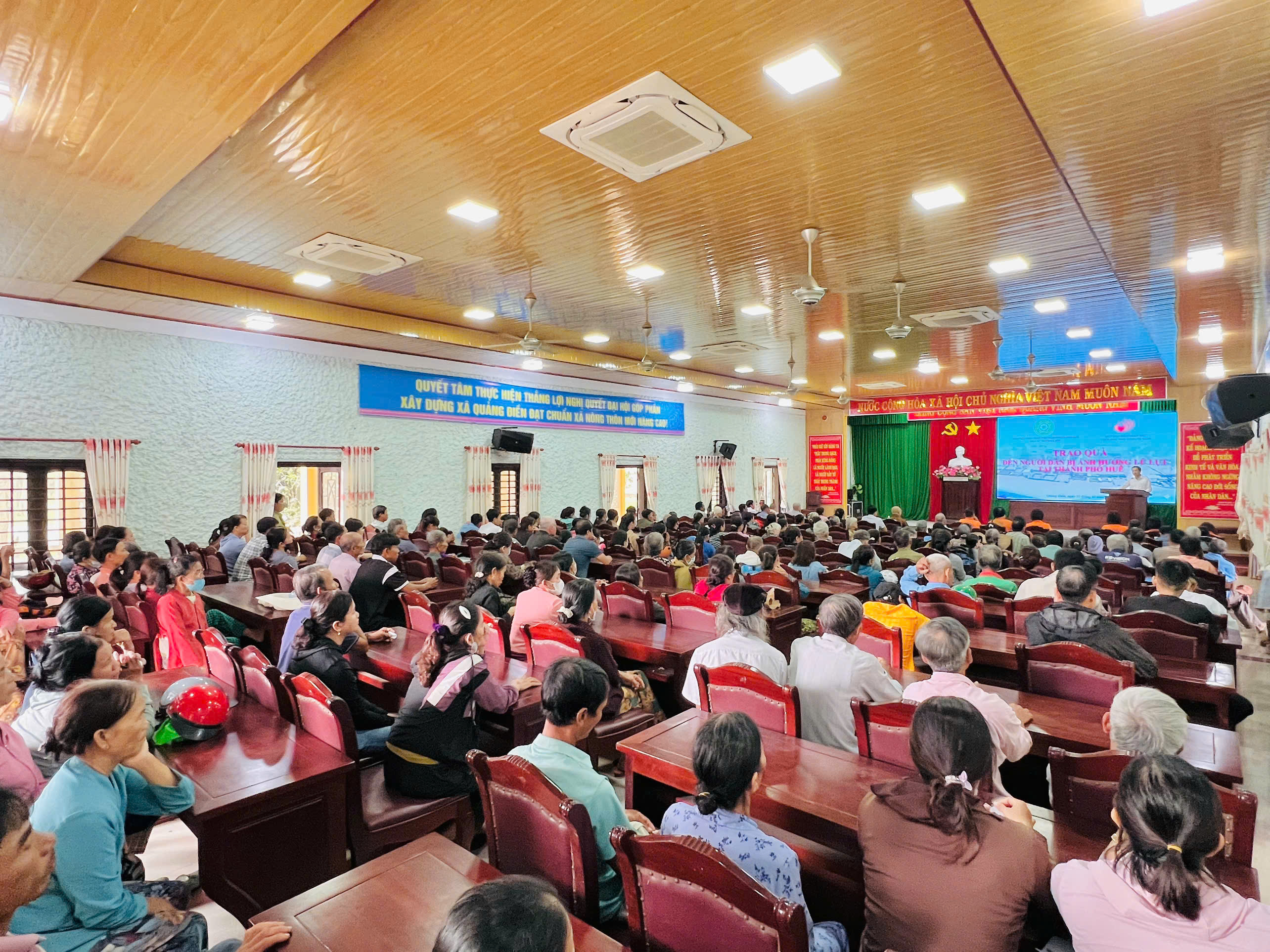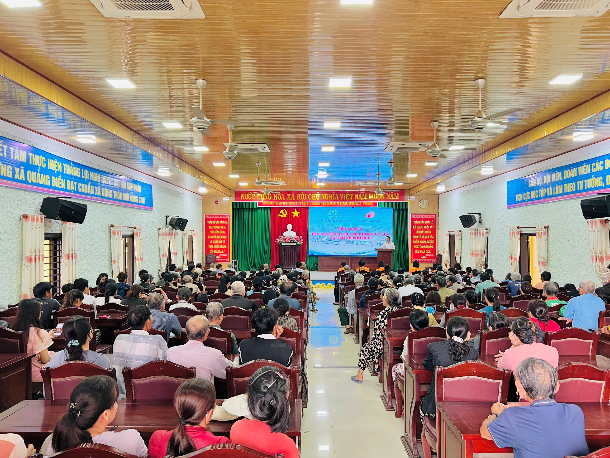 Tại xã Quảng Điền, đoàn đã trực tiếp trao tặng 200 suất tịnh tài hỗ trợ cho 200 hộ gia đình thuộc diện khó khăn nhất trên địa bàn. Mỗi suất quà là 500.000 đồng tiền mặt, với tổng kinh phí hỗ trợ trực tiếp lên đến 100 triệu đồng.