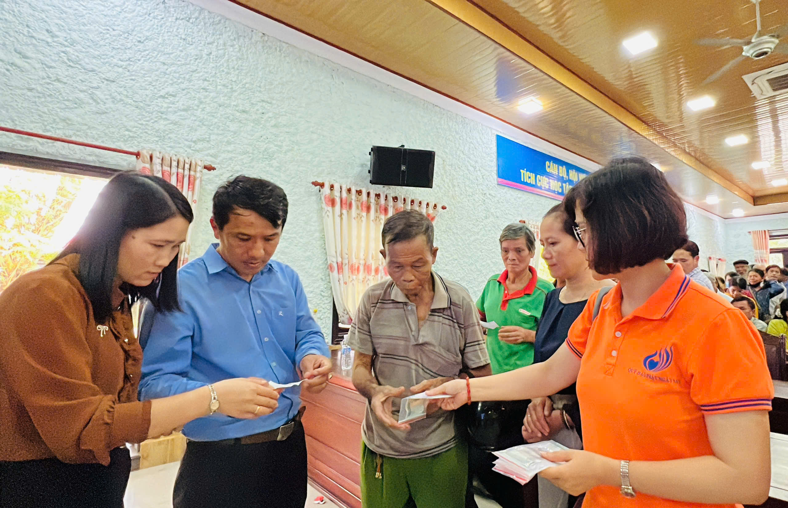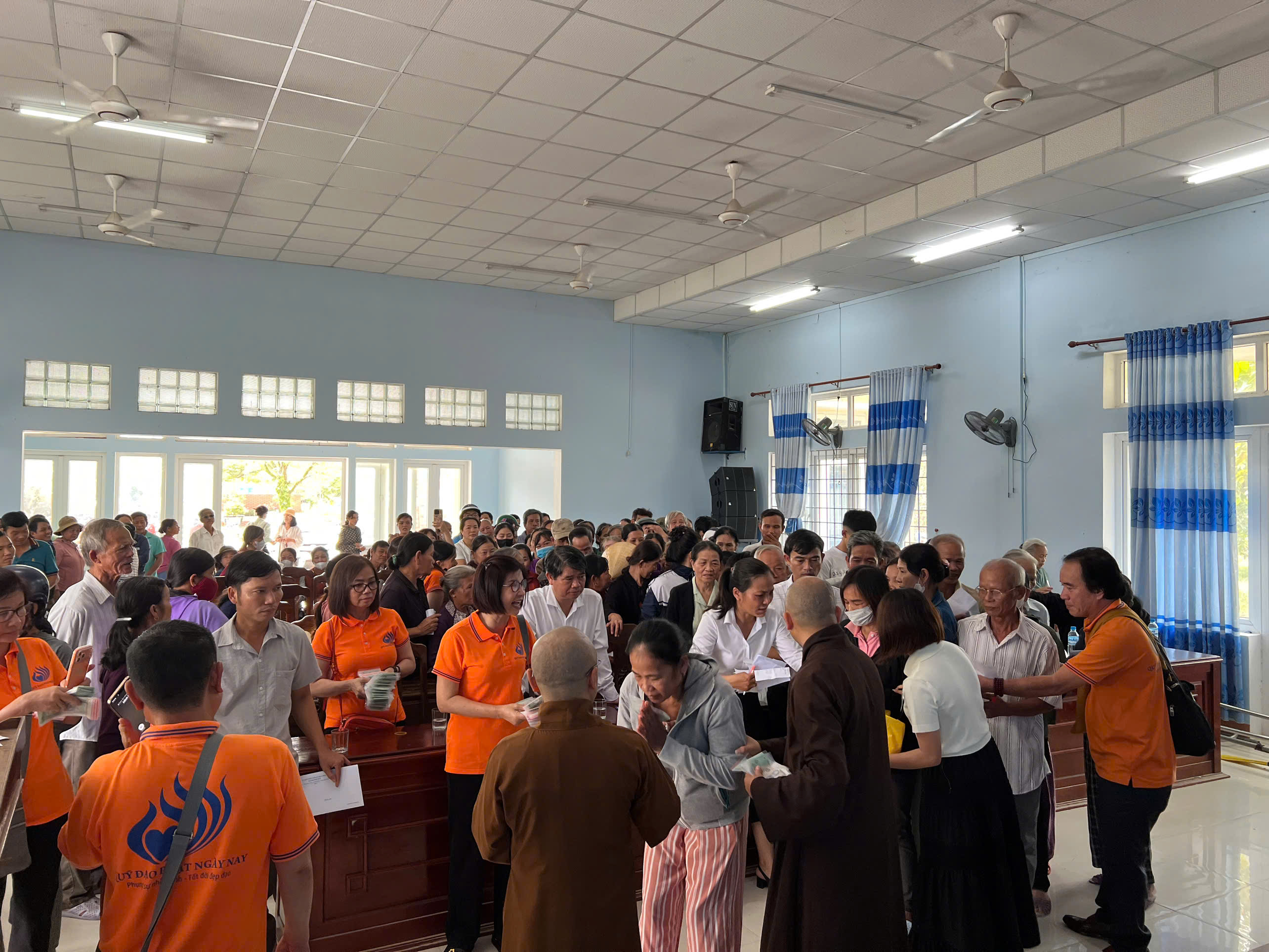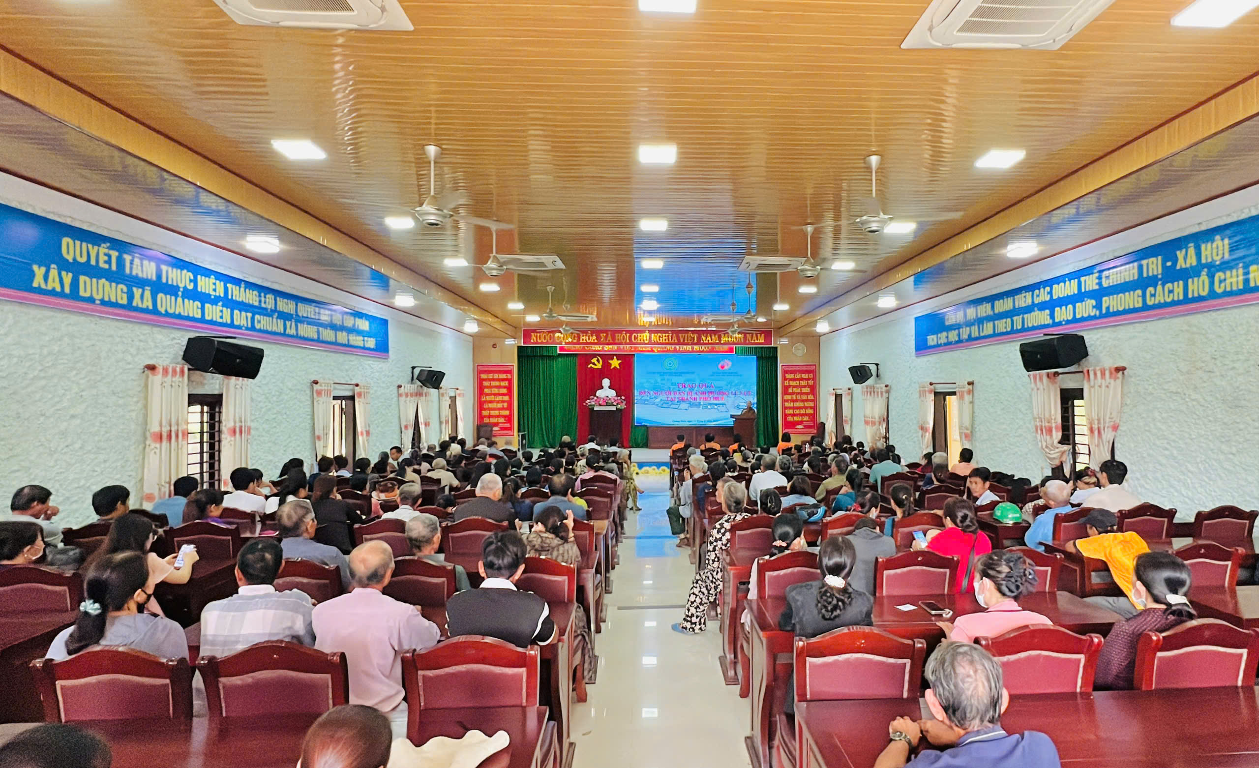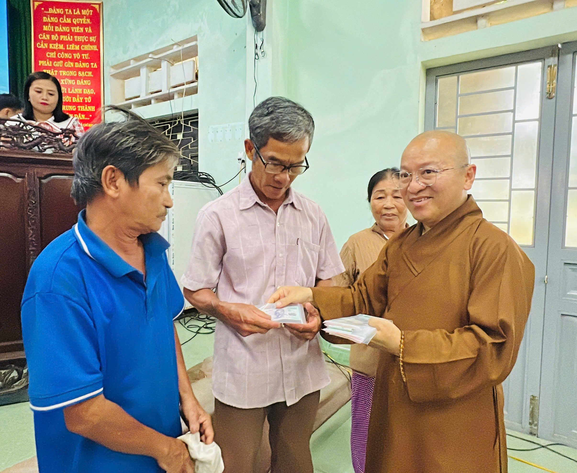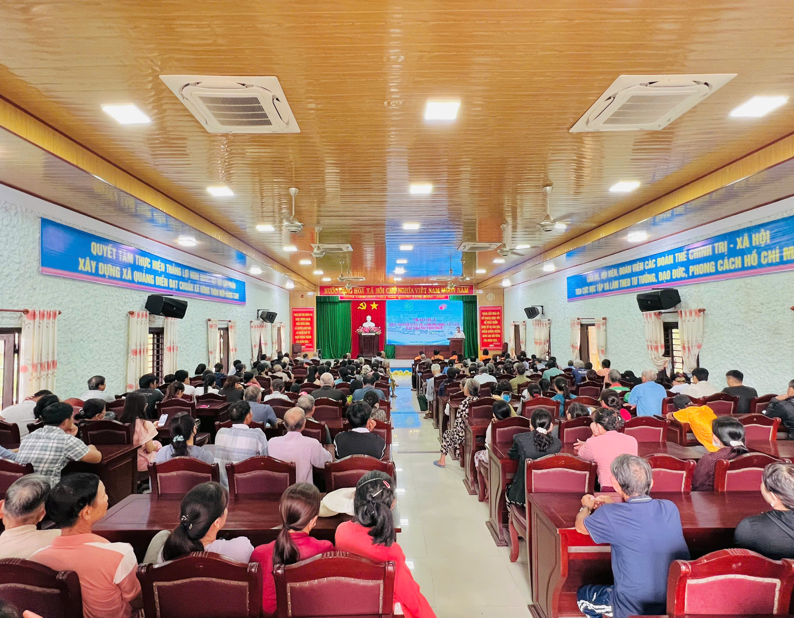 Tại xã Quảng Điền, đoàn đã trực tiếp trao tặng 200 suất tịnh tài hỗ trợ cho 200 hộ gia đình thuộc diện khó khăn nhất trên địa bàn. Mỗi suất quà là 500.000 đồng tiền mặt, với tổng kinh phí hỗ trợ trực tiếp lên đến 100 triệu đồng.