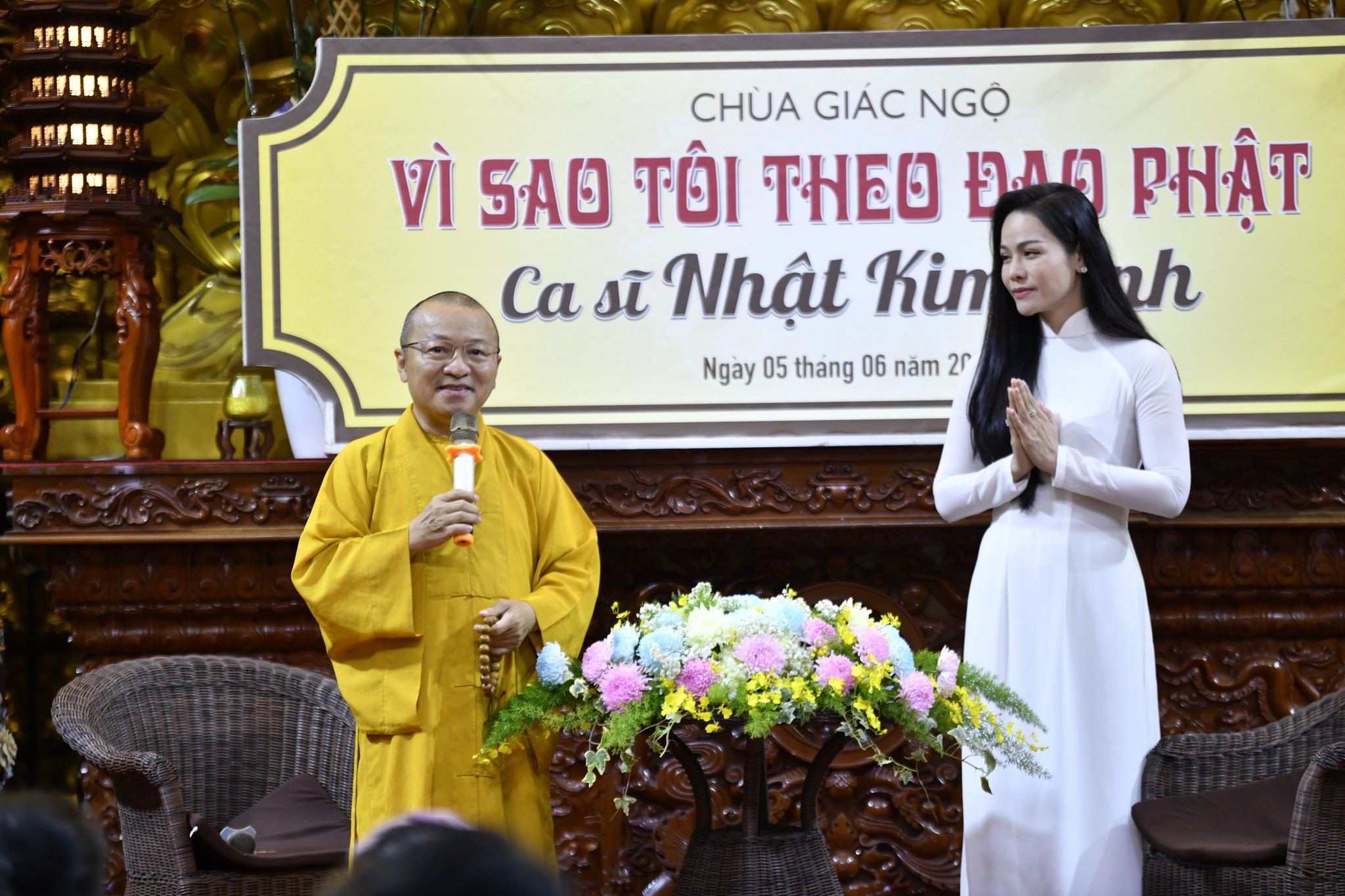 Đại diện cho Tăng đoàn Chùa Giác Ngộ, ĐĐ. Thích Quảng Tịnh đã điều phối chương trình và cùng hơn 800 bạn trẻ có mặt khắp 3 tầng lầu của Chùa gửi lời chào đến Nhật Kim Anh bằng một tràng pháo tay dài giòn giã trong sự hân hoan, hứng khởi. Nhật Kim Anh cho biết cô rất tri ân tấm lòng yêu thương của Tam Bảo và các bạn trẻ đã dành cho mình. Sau đó, mọi người đã cùng nhau theo dõi một video clip ngắn tóm tắt tiểu sử về cuộc đời, với những thành công trong sự nghiệp cùng những thăng trầm, biến cố mà Nhật Kim Anh đã trải qua. Xem xong, Nhật Kim Anh đã không thể cầm được nước mắt. Cô chia sẻ rằng bản thân rất xúc động bởi những hình ảnh đau thương ấy dường như chợt sống lại trong mình. Tuy nhiên, dũng cảm nhìn nhận và đối diện với nó, lấy nó làm động lực để bản thân sống tốt ở hiện tại và tương lai là điều mà cô luôn thầm nhủ với chính mình.