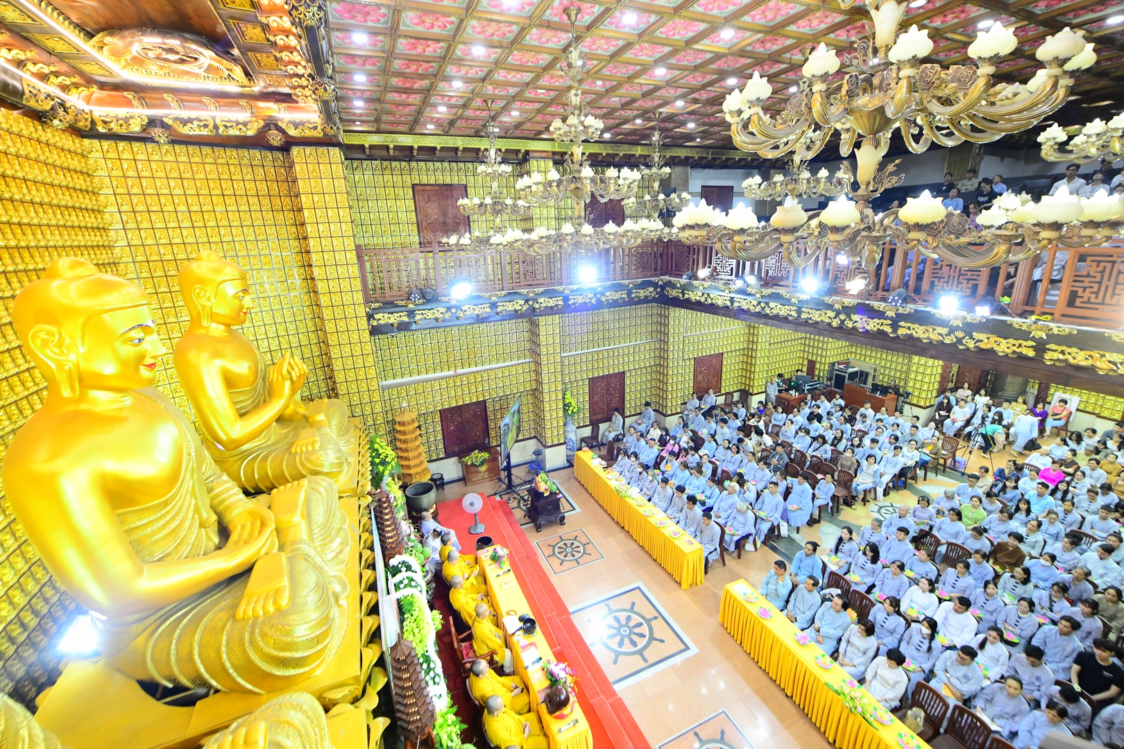 Tiếp đó, dưới sự hướng dẫn của Thượng toạ chủ lễ, toàn thể đạo tràng đồng thanh xướng lời thọ nhận tam quy, ngũ giới. Đây chính là những "hàng rào thép" bảo vệ thân tâm cho nhiều người con Phật không rơi vào các nghiệp phi đạo của thế gian, bồi đắp phúc lành, trồng thêm duyên tốt để đời đời sau mãi là sứ giả của Như Lai.