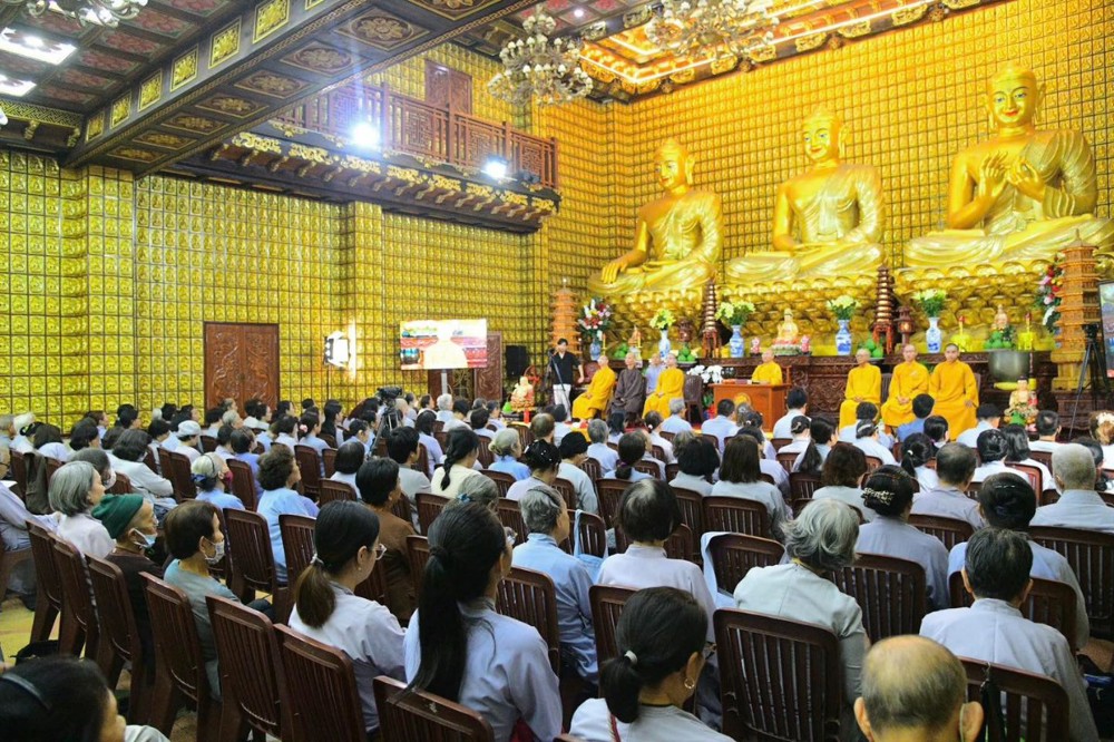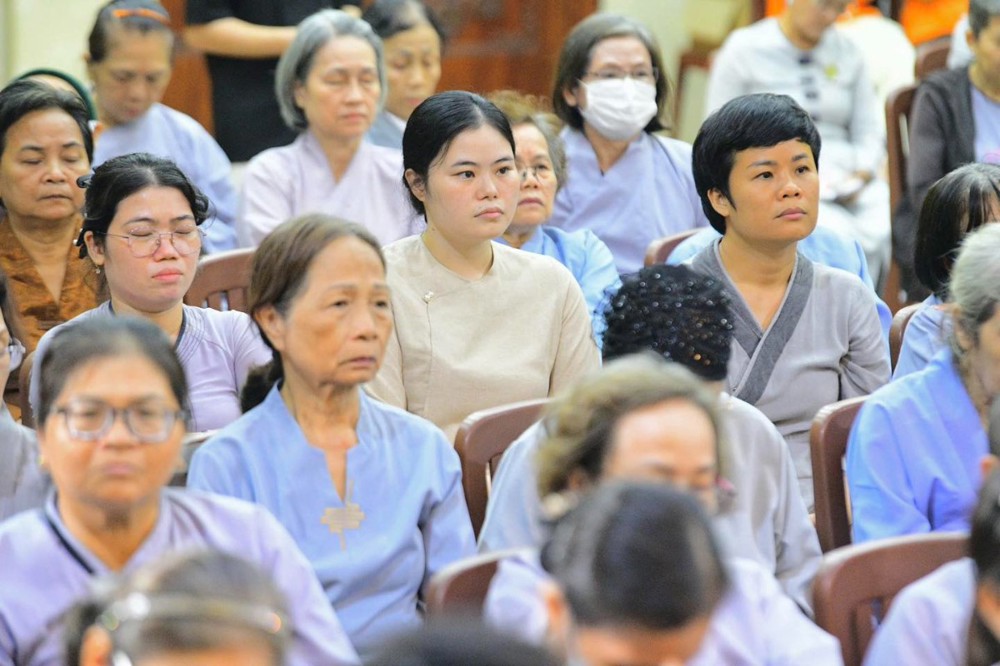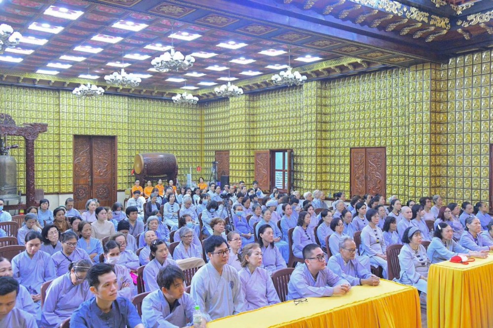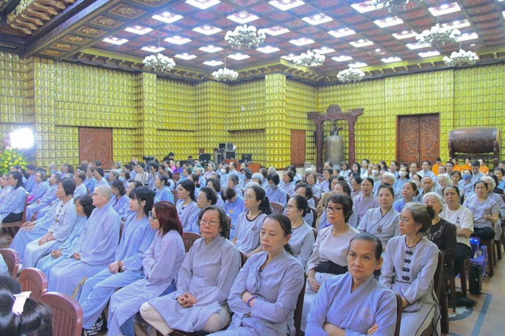 Vào buổi sáng, đại chúng trang nghiêm lắng nghe pháp thoại từ TT. Thích Nhật Từ. Trong bài pháp, Thượng tọa nêu bật tinh yếu “Bốn đoạn kinh nên quán niệm và thực tập thường xuyên” đến hội chúng hiện diện.
